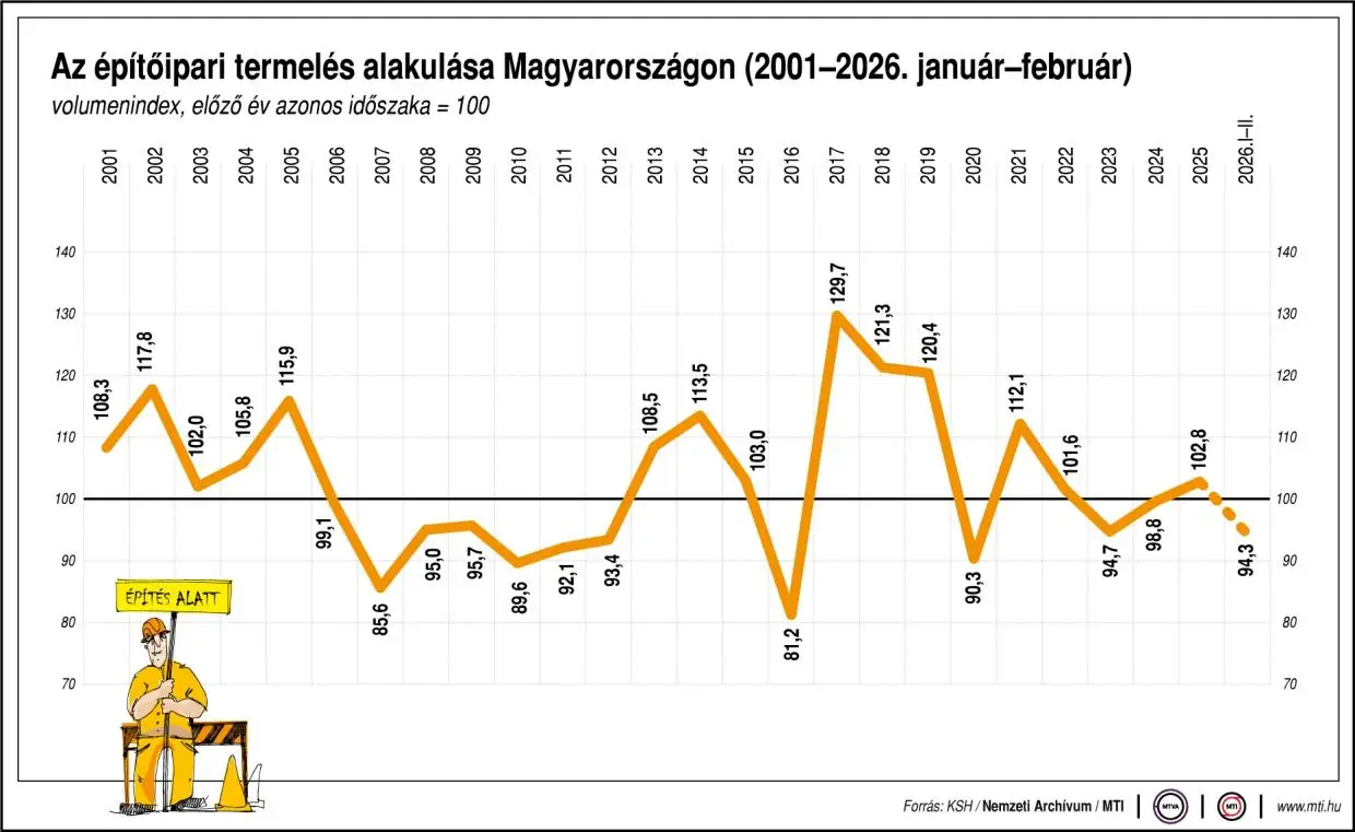 2026 februárjában az építőipari termelés volumene a nyers adatok, illetve a munkanaptényezővel kiigazított adatok szerint egyaránt 0,4 százalékkal elmaradt az egy évvel korábbitól – jelentette április 13-án a Központi Statisztikai Hivatal (KSH).